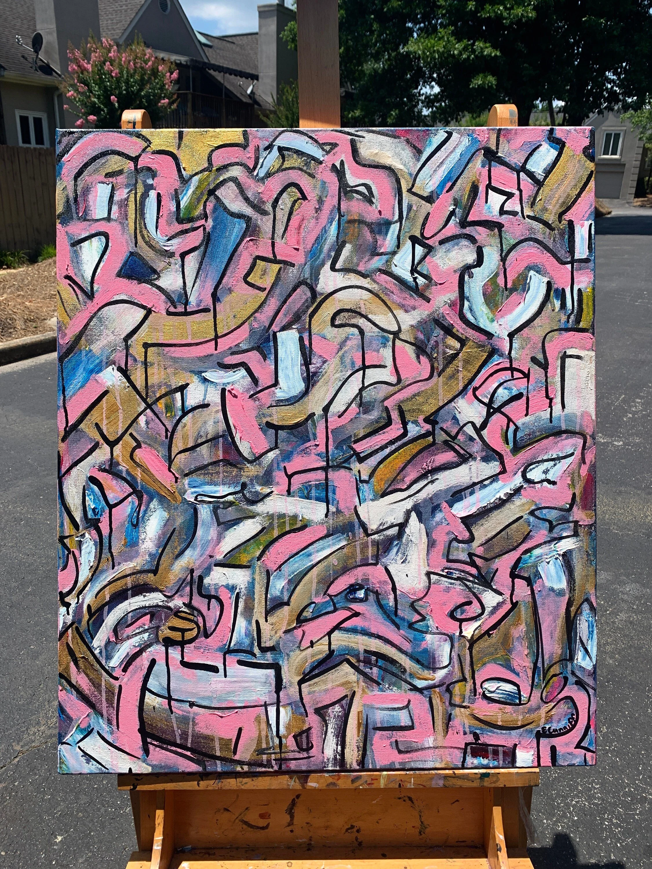 This energetic and bright painting is sure to brighten the energy in any room. With hues of millennial pink, gold, and black, the movement of this painting will never leave you bored.